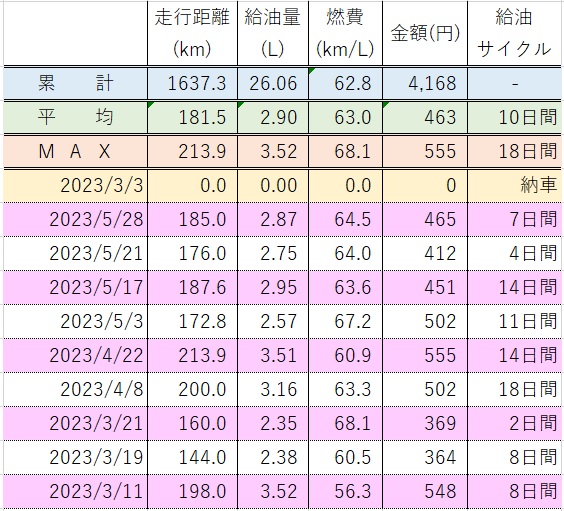 あまり気にせず、走った方が楽しいような気がするので6月からは燃費メーターを見ないようにして走ってみようと思います。