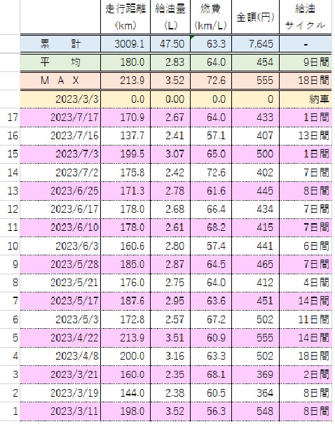 燃費 : 57.1km/L(前回 65.0km/L) - 給油日 : 2023/7/17