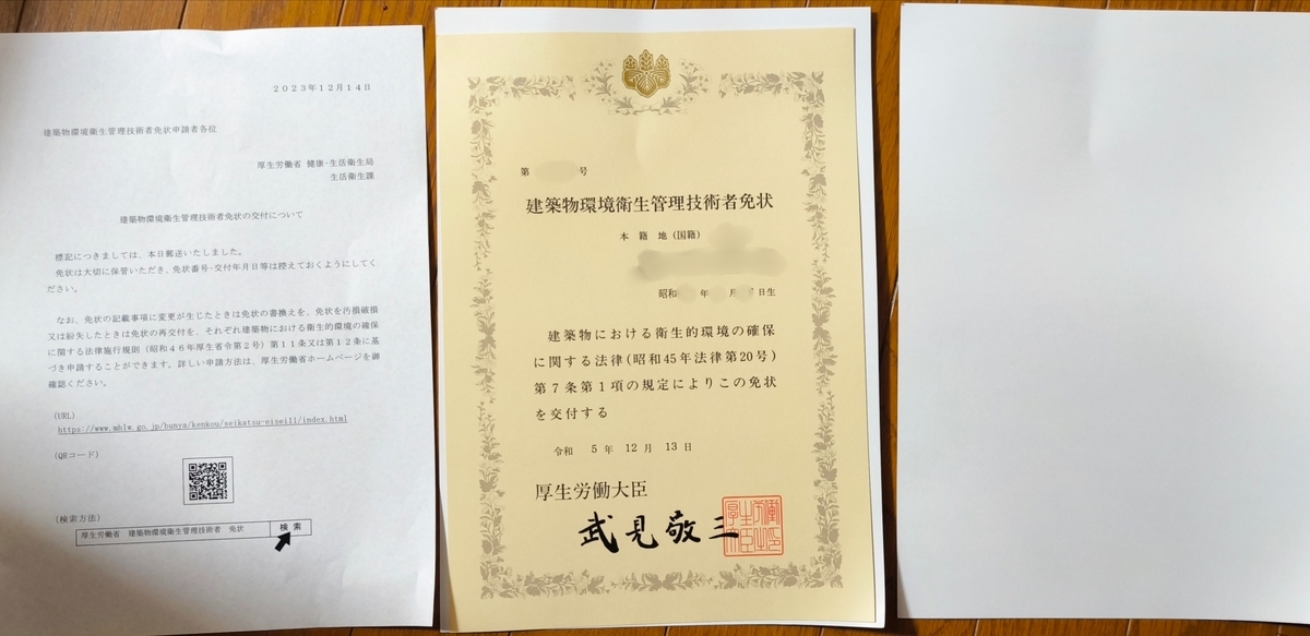建築物環境衛生管理技術者 資格免状!