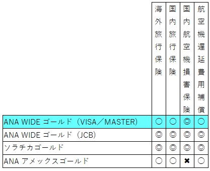 ANA WIDE ゴールドカード(VISA )の適用は以下の通りでした。