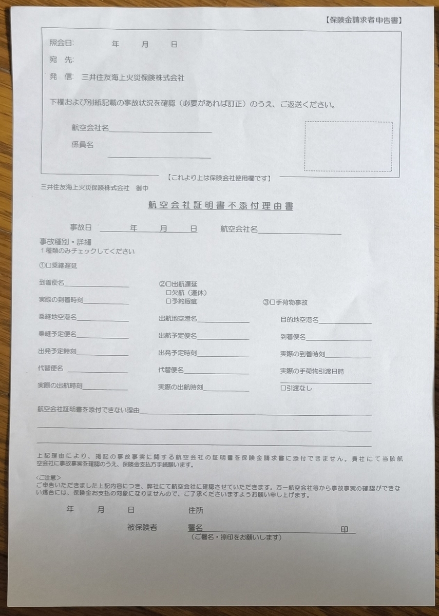 - 保険金請求者申告書及び航空会社証明書不添付理由書