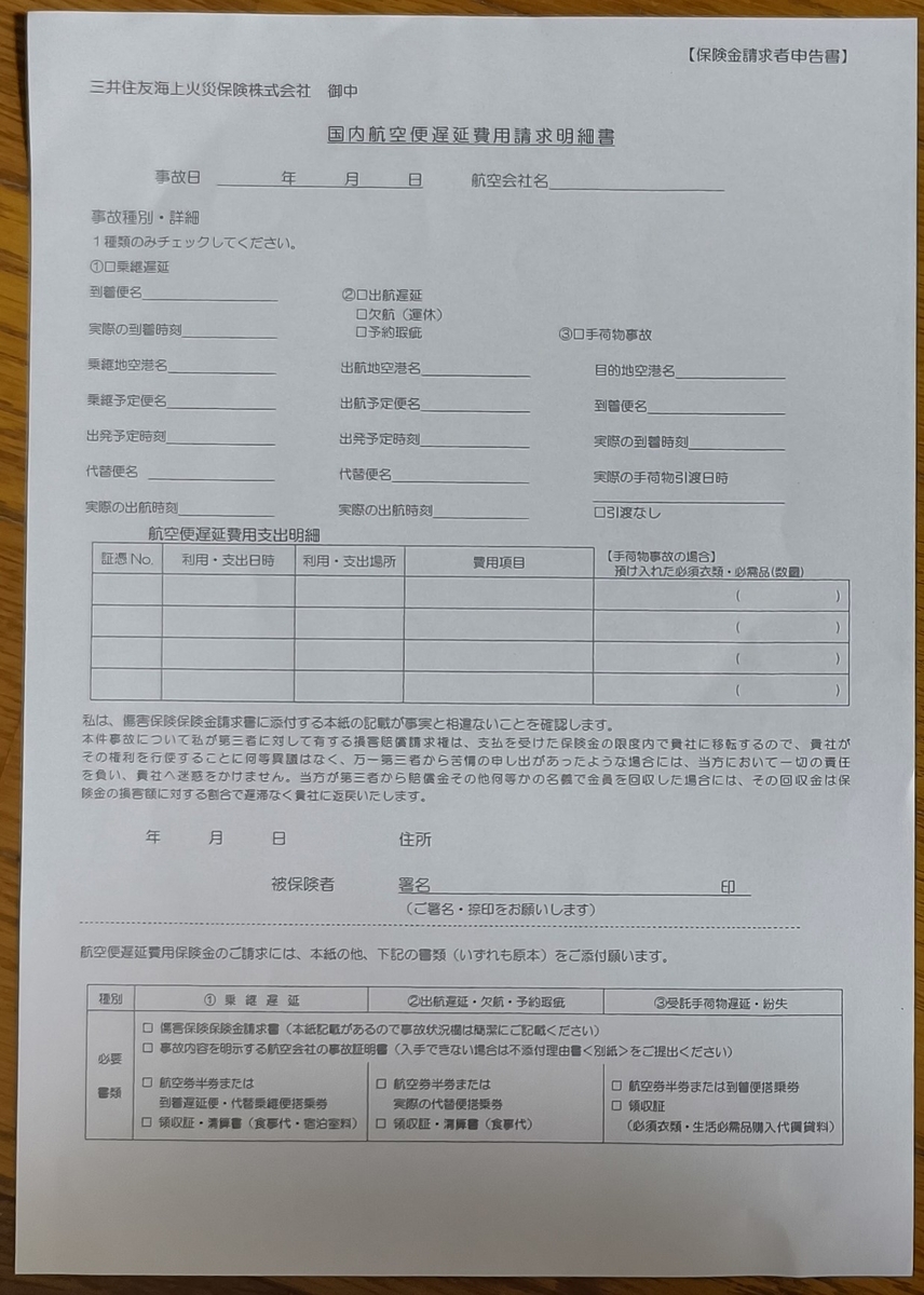 保険金請求者申告書及び国内航空便遅延費用請求明細書内に記載があります。